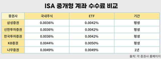 증권사 ISA에서 국내주식 및 ETF 부문에서 수수료율이 상이하다. 이 중 평생 수수료율을 우대받을 수 있는 증권사는 ▲삼성증권 ▲한국투자증권 ▲KB증권 ▲신한투자증권 등 4곳이다. 나무증권은 1년간 우대혜택을 받을 수 있다. ETF는 운용보수비와 주식 거래 시 유관기관 수수료가 따로 붙는다.