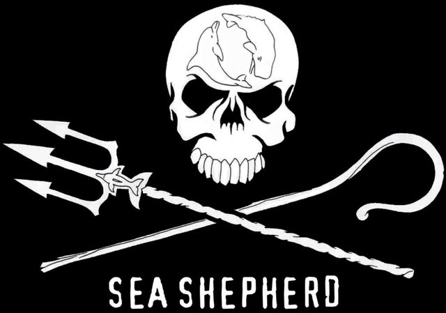 시셰퍼드는 ‘착한 해적’이에요. 생명을 파괴하는 이들로부터 생명을 지키는 해적이요. 깃발의 검은색 바탕은 멸종과 생명의 끝, 바다의 죽음을 의미해요. 해골은 바다 생명의 감소와 그 원인인 인류를 가리키고요. 그 아래에는 ‘보호’를 상징하는 목동의 지팡이와 ‘공격’을 의미하는 삼지창이 교차하고 있어요. 시셰퍼드의 철학인 ‘공격적 비폭력’을 담은 건데요. 비폭력적으로 열정, 투지, 사랑, 용기를 불태우겠다는 거예요.