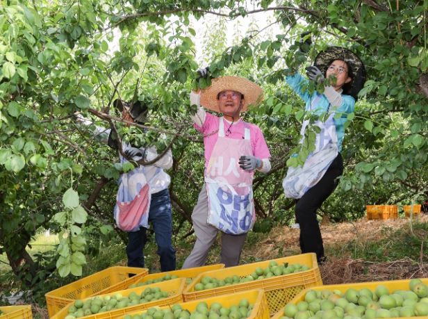 시는 5월 말부터 일손 부족으로 어려움을 겪고 있는 지역 내 고령농가, 영세농가, 장애농가 등을 대상으로 공무원, 유관기관, 봉사단체와 기업들이 한마음으로 매실 수확 작업을 돕고 있다.