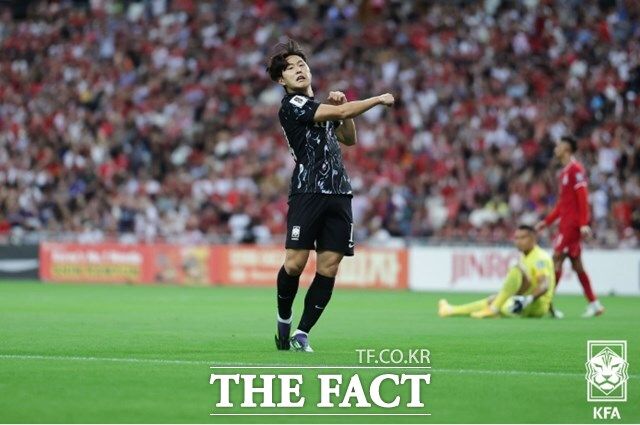 전반 9분 선제 결승골에 이어 '멀티골'을 기록한 이강인이 기뻐하고 있다./싱가포르=KFA(정재훈)