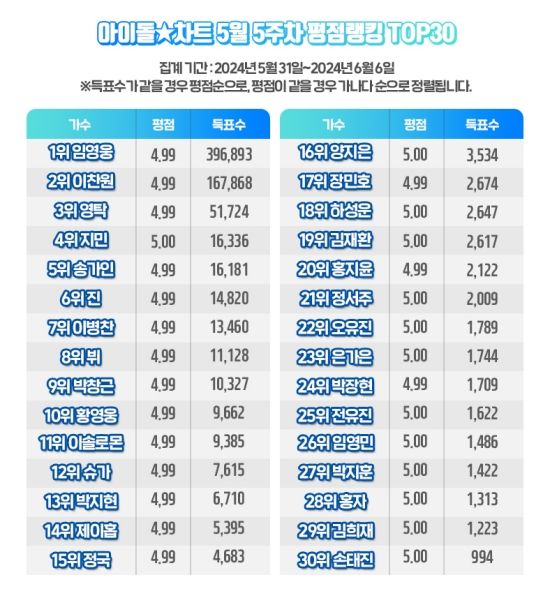 (엑스포츠뉴스 이정범 기자) 임영웅이 5월 5주 차 아이돌차트 평점랭킹에서 최다득표자에 올랐다.