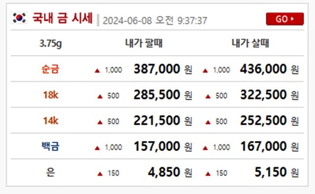 순금(24K) : 매입가 43만 6000원 / 매도가 38만 7000원