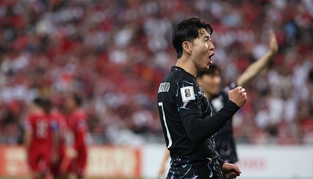 6일(현지 시각) 싱가포르 국립경기장에서 열린 2026 북중미 월드컵 아시아 2차 예선 조별리그 C조 5차전 한국과 싱가포르의 경기에서 팀 세 번째 골을 넣은 손흥민이 세리머니를 하고 있다. / 연합뉴스