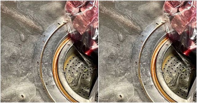 A 씨가 공개한 사진을 보면 싱크대 내 고기가 담긴 봉지 바로 옆에 작은 바퀴벌레 수십마리가 기어다니고 있다.