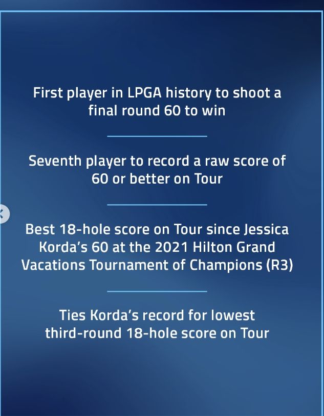스트롬의 이번 최종일 60타는 LPGA투어 사상 최종일 60타를 쳐서 우승한 것이 처음이고, 제시카 코다(미국)가 2021년 그랜드 힐튼 버케이션스 토너먼트 오브 챔피언십 3라운드에서 친것과 타이기록이다. 또한, LPGA투어 선수 중 60타를 치거가 이보다 좋은 성적을 낸 7번째 선수로 이름을 올렸다.