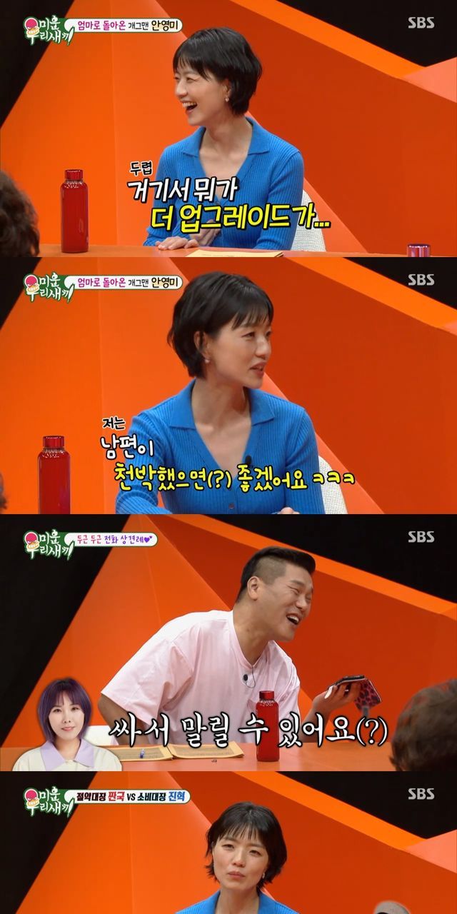 이어 안영미는 "남편이 안아주고 뽀뽀하는 건 좋아하는데 그다음을 안 간다. 저는 남편이 천박했으면 좋겠다"라며 스킨십에 대한 불만을 이야기했다. 급기야 MC 서장훈은 눈을 피하며 안영미에게 "저쪽 보고 (이야기) 해"라고 당황해 폭소를 자아냈다. 이어 안영미는 "남편에게 더블 누드를 제안했는데 '제발 여보만 찍어라'라고 하더라. 그래서 혼자 세미누드를 찍어봤다"고 밝혔다.