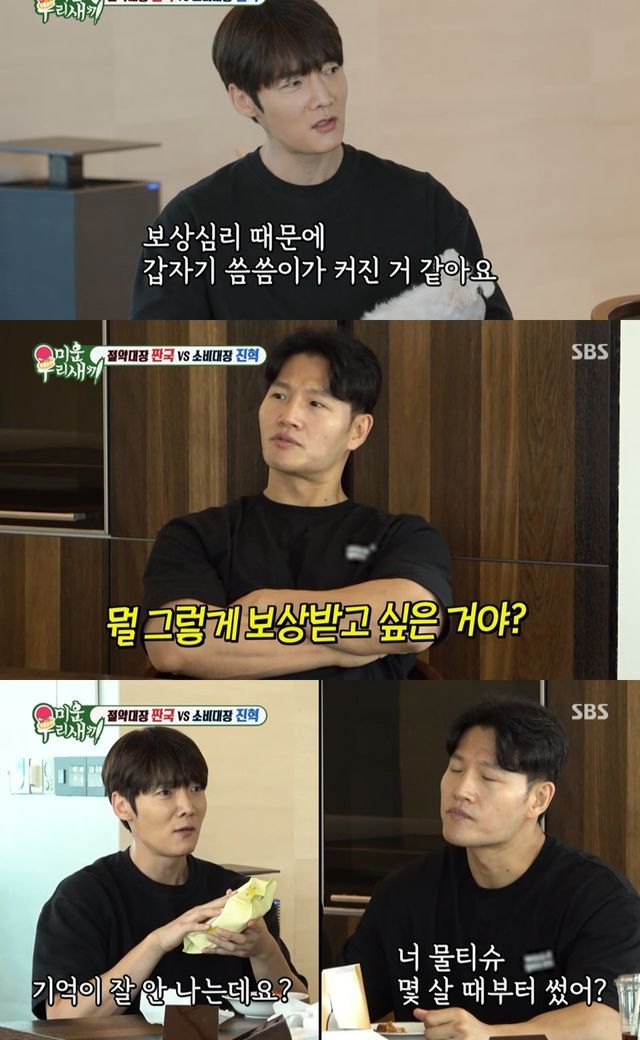 계속해서 김종국과 이상민이 새로 이사한 최진혁 집을 방문했다. 평소 절약정신이 강한 김종국과 아들이 가까이 지내기를 바랐던 최진혁 母의 바람이 반영된 집들이었던 것. 상민이 선물로 물티슈를 선물하자 종국은 "사람이 물티슈를 쓸 일은 없어"라며 못마땅한 기색을 비쳤다. 에어컨을 18도로 틀어 놓은 진혁에게 종국은 "여름에 아무것도 안 입고 선풍기만 틀고 자면 살짝 추울 정도다"라며 진정한 자린고비의 자세를 어필했다. 최진혁은 "20대에 열심히 일해서 집안 빚을 갚고 나니 보상심리가 생겨 그렇다"라고 변명했고, 김종국은 "열심히 살았는데 뭘 그렇게 보상받고 싶은거야"라며 전혀 이해하지 못했다. 이후에도 두 사람은 물티슈 사용을 두고 팽팽한 의견 대립을 보였고, 이 장면은 시청률이 16.2%까지 올라 '최고의 1분'을 기록했다.