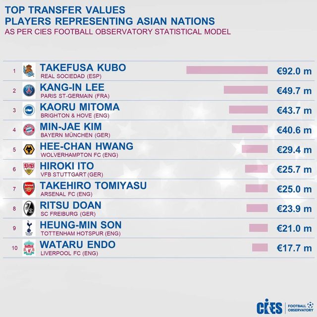 아시아 선수 중 시장가치 전체 1위는 구보 다케후사(레알 소시에다드)였다. 그의 시장가치는 9200만 유로(약 1369억 원)다. 아시아 선수 중 유일하게 1000억 원 이상을 기록했다. 구보는 2001년생이다. 그는 2023-24시즌 스페인 프리메라리가에서 팀의 에이스로 활약하며 7골 4도움을 올렸다.