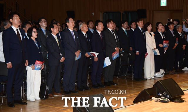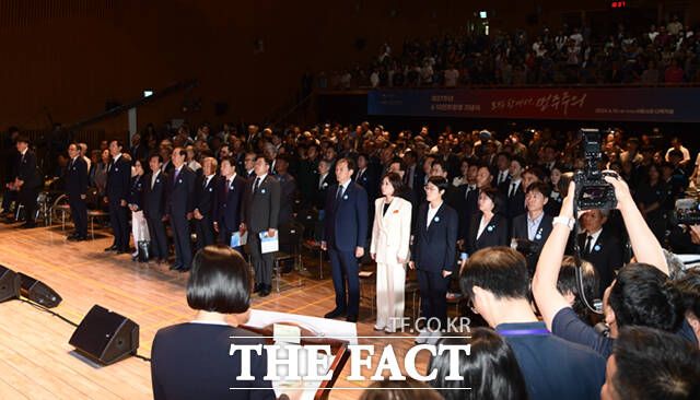 한덕수 국무총리와 오세훈 서울시장, 조국 조국혁신당 대표 등 참석자들이 '상록수'를 제창하고 있다.