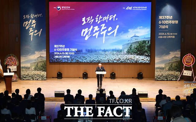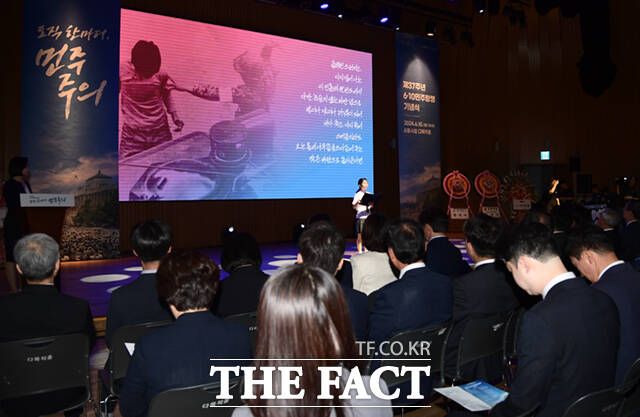 행정안전부가 주최하고 민주화운동기념사업회가 주관한 올해 기념식은 '오직 한마디, 민주주의'라는 주제로 민주주의를 다시 한번 되새겨보고 이를 통해 더 나은 미래를 향해 나아가는 화합과 상생의 메시지를 담고자 했다.