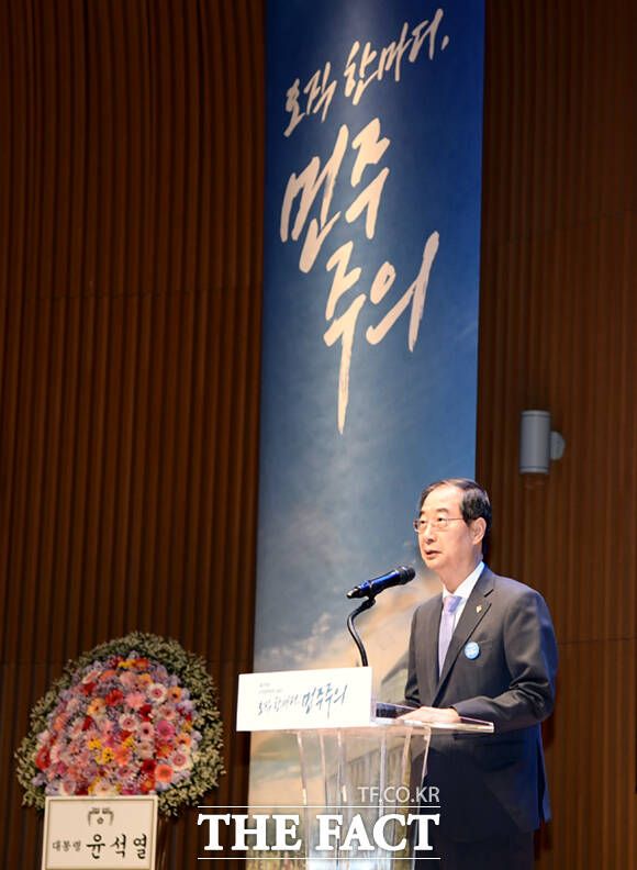 [더팩트ㅣ이새롬 기자] 한덕수 국무총리가 10일 오전 서울시청 다목적홀에서 열린 '제37주년 6·10민주항쟁 기념식'에서 기념사를 하고 있다.