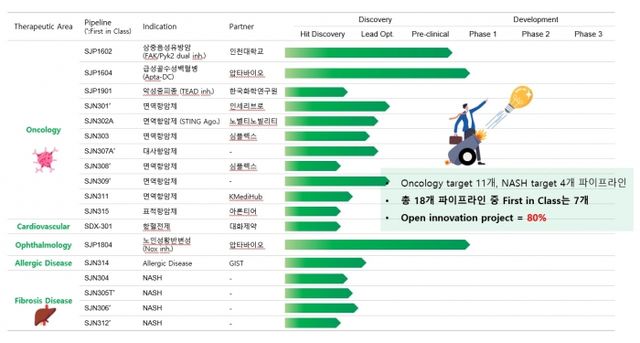 현재 삼진제약이 보유 중인 신약 파이프라인은 총 18개다. 주력 분야는 항암제 개발로, 온콜로지(종양학) 타깃이 11개에 달한다. 특히 회사는 개방혁 혁신 전략을 통해 파이프라인을 확장하고 물질 개발에 속도를 내고 있다. 오픈이노베이션 프로젝트로 진행되고 있는 파이프라인은 전체의 80%에 이른다.