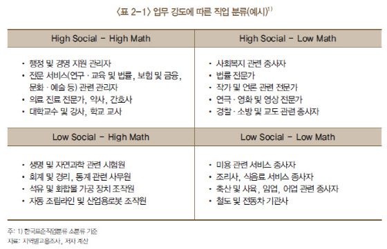 사회적 기술이 집중된 일자리로는 법률 전문가, 작가 및 언론 관련 전문가 등이 예시로 제시됐고, 인지적 기술 집중 일자리로는 생명 및 자연과학 관련 시험원, 회계 및 경리, 통계 관련 사무원 등이 언급됐다.