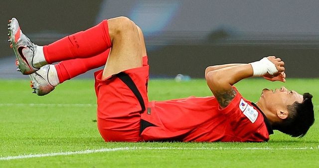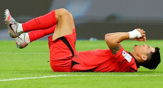 2022년 11월 24일 오후(현지 시각) 카타르 알라이얀의 에듀케이션 시티 스타디움에서 열린 2022 카타르 월드컵 조별리그 H조 1차전 대한민국과 우루과이 경기에서 대표팀 수비수 김민재가 우루과이 다르윈 누녜스를 수비하다 상처를 입고 고통스러워하고 있다. / 연합뉴스