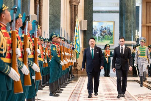 이날 수도 아시가바트에 도착한 윤 대통령은 공식환영식에서 기마대의 호위를 받으며 대통령궁에 입장해 의장대를 사열했다.