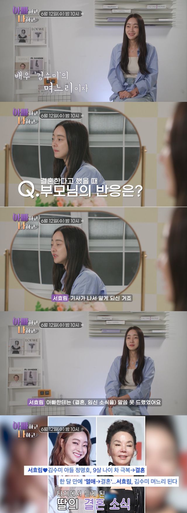 12일 TV조선 '아빠하고 나하고' 측은 방송을 앞두고 '서효림, 김수미 아들과 상견례도 없이 결혼! 당시 아빠의 심정은?!'라는 제목의 영상을 선공개했다.