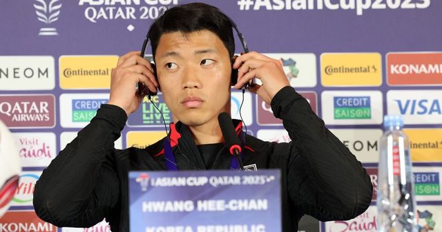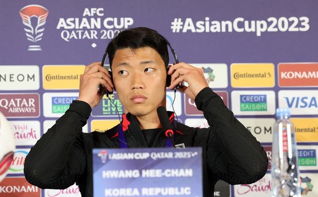 2023 아시아축구연맹(AFC) 카타르 아시안컵 바레인과의 첫 경기를 앞둔 대한민국 축구대표팀 황희찬이 2024년 1월 14일(현지 시각) 카타르 도하 메인미디어센터(MMC)에서 열린 공식 기자회견에서 통역기를 착용하고 있다. / 뉴스1