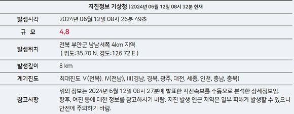 앞서 이날 오전 8시 26분께 전북 부안군 남남서쪽 4㎞ 지점(북위 35.7, 동경 126.72)에서 진도 4.8 규모의 지진이 발생했다.
