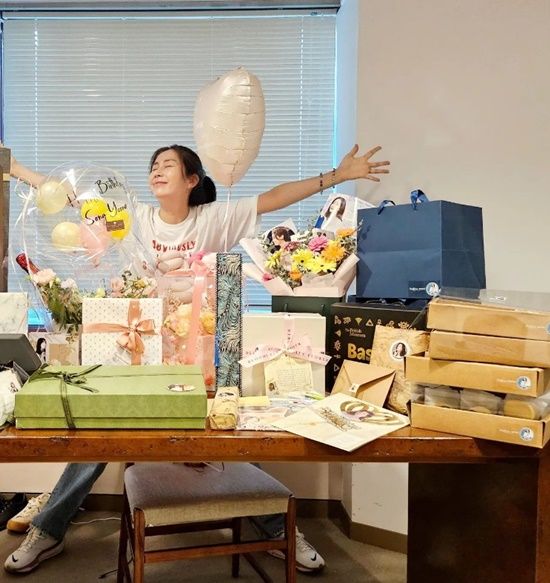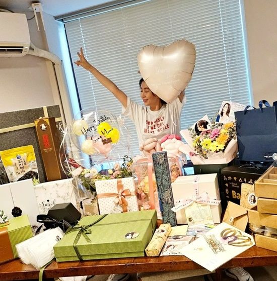 공개된 사진 속 송윤아는 집 안을 꽉 채운 팬들의 선물이 놓여 있는 탁자 뒤에서 두 팔을 활짝 편 채 익살스러운 표정을 짓고 있다.