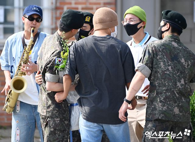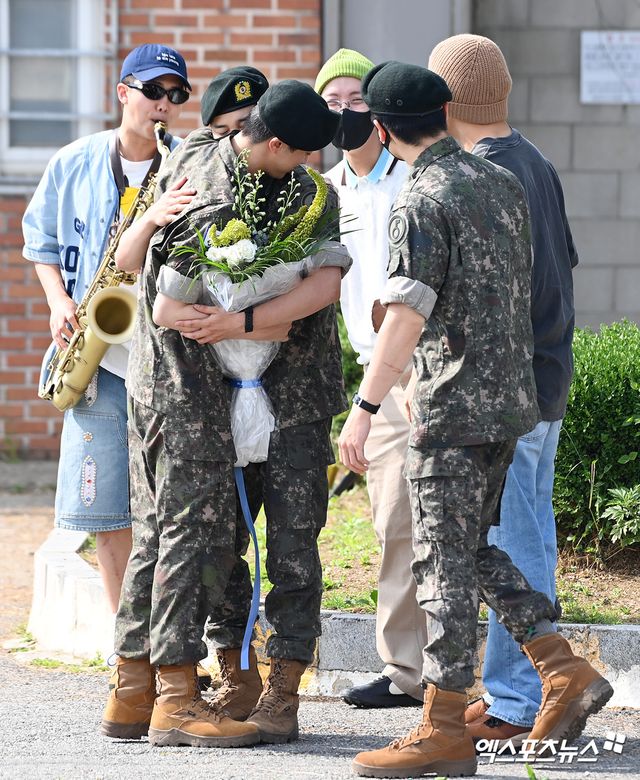 현재 사회복무요원으로 근무 중인 슈가를 제외한 제이홉, RM, 지민, 뷔, 정국 방탄소년단 멤버들이 전역 마중을 나와 반갑게 인사를 나눴다.