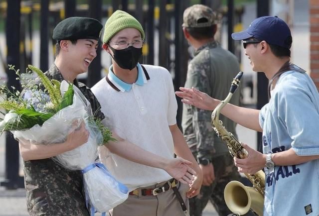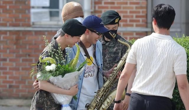 この日の午前、JINは京畿道漣川(キョンギド・ヨンチョン)所在の陸軍第5歩兵師団の新兵教育大隊の正門にあらかじめ出迎えたRM、ジミン、J-HOPE、V、ジョングクに会った。