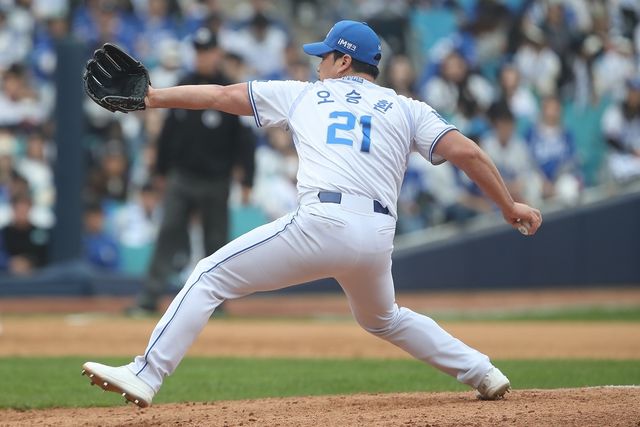 2024년 3월 31일 오후 대구 삼성라이온즈파크에서 열린 프로야구 '2024 신한은행 SOL KBO리그' SSG 랜더스와 삼성 라이온즈의 경기에서 연장 10회 초 마운드에 오른 삼성 마무리 오승환이 역투하고 있다. / 뉴스1