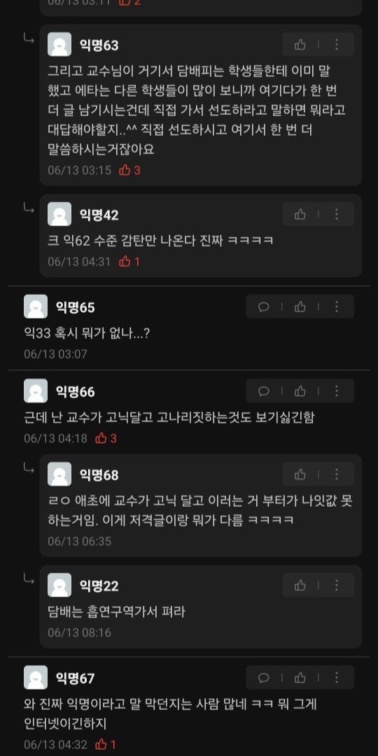 모 학교의 어느 교수님께서 에타에 흡연충들의 개판매너에 대해 글을 썼다가 발작한 흡연자들께서 풀발 중 ㄷㄷ