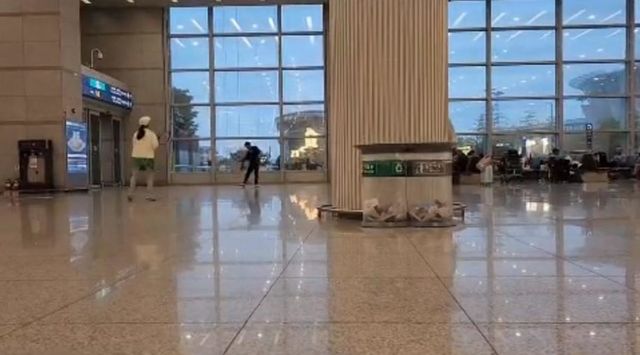 영상을 살펴보면 이들의 옆에는 대기석이 마련돼 있어 공항 이용객들이 앉아서 쉬고 있었고, 커플은 출입구와 가까운 장소에서 테니스를 쳤다.