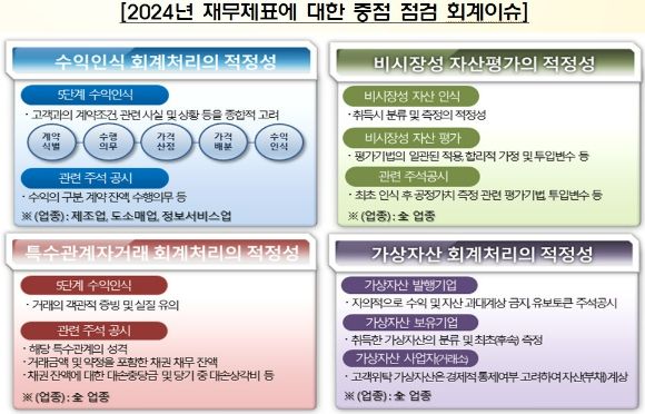 금감원은 네 가지 주제에 맞춰 2024년 재무제표가 확정되는 내년 초 이후 중점 심사 기업을 선정해 중점 감리에 나서게 된다.