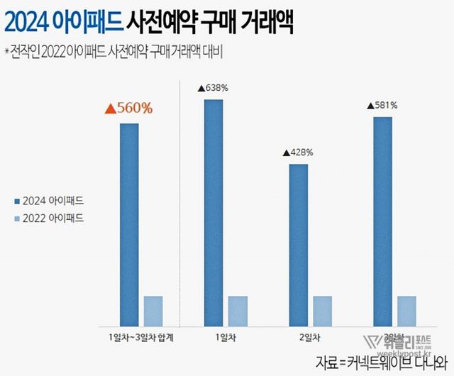 이커머스 전문기업 커넥트웨이브의 다나와는 애플 2024 아이패드 에어/프로의 사전예약 판매가 전작 대비 높은 관심을 받고 있다고 밝혔다. 사전예약 첫 3일간 2024 아이패드의 구매 거래액은 전작인 2022 아이패드 대비 560% 증가했다.