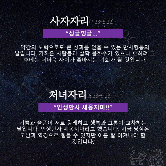 선배나 후배로부터 사람을 소개받기에 적당한 때입니다. 친구들과 함께 하는 미팅 보다는 당신 혼자만이 나가는 소개팅이 좋습니다. 사자자리의 사람이 당신에게 행운을 가져다 줍니다.