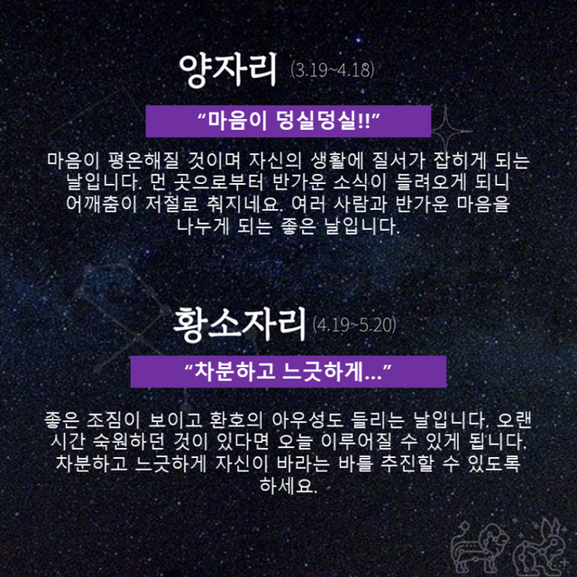 약간의 노력으로도 큰 성과를 얻을 수 있는 만사형통의 날입니다. 가까운 사람들과 살짝 불화수가 있으나 오히려 그 후에는 더더욱 사이가 좋아지는 기회가 될 것입니다.