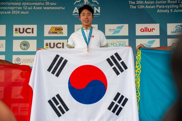 사이클 국가대표 김유로(한국국토정보공사 소속)가 2024 아시아사이클선수권대회 남자부 개인도로 경기에서 금메달을 목에 걸었다.