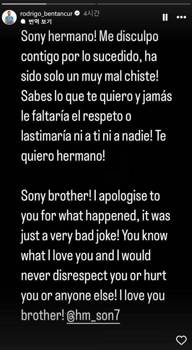 토트넘 벤탄쿠르가 손흥민 인종차별 논란에 휩싸이자, 자신의 SNS 계정을 통해 사과문을 올렸다. / 로드리고 벤탄쿠르 인스타그램
