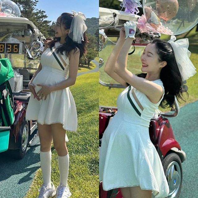 사진 속 아야네는 흰색 민소매 골프복을 입고 골프장 나들이를 떠났다. 그는 다가올 아기 탄생을 축하하는 풍선을 든 채 환한 미소를 짓고 있다.
