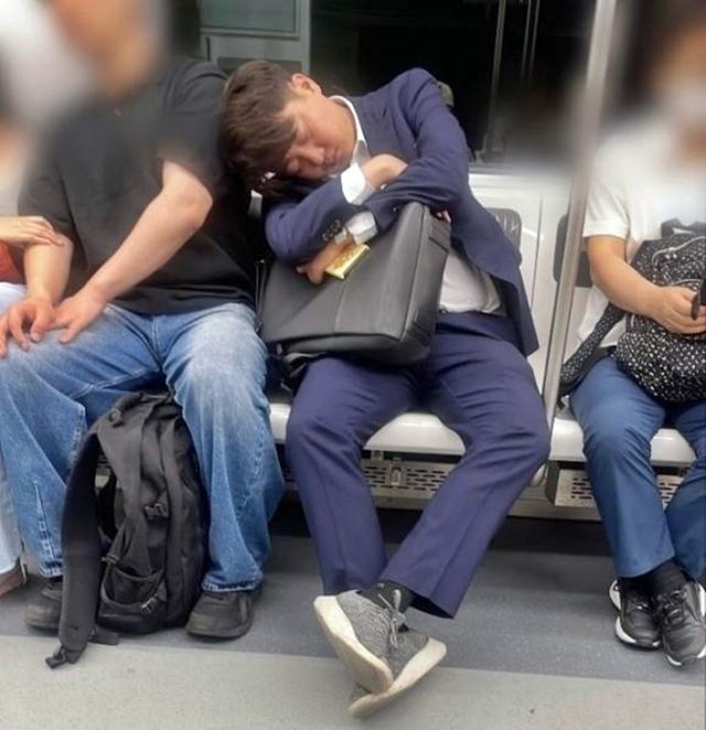 13일 온라인 커뮤니티에 이준석 개혁신당 의원이 지하철 자리에 앉아 잠든 모습이 담긴 사진이 올라와 화제가 됐다. 그는 남색 정장에 가방과 휴대전화를 손에 꼭 쥔 채, 옆자리 승객에게 기대 잠이 든 모습이다. 이 의원은 국민의힘 대표 시절부터 대중교통을 이용해 출퇴근한 것으로 알려졌다. / 온라인 커뮤니티
