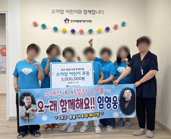 14일 한국백혈병어린이재단은 임영웅 팬카페 '대구 영웅시대 투게더방'으로부터 300만 원을 기부받았다고 밝혔다.