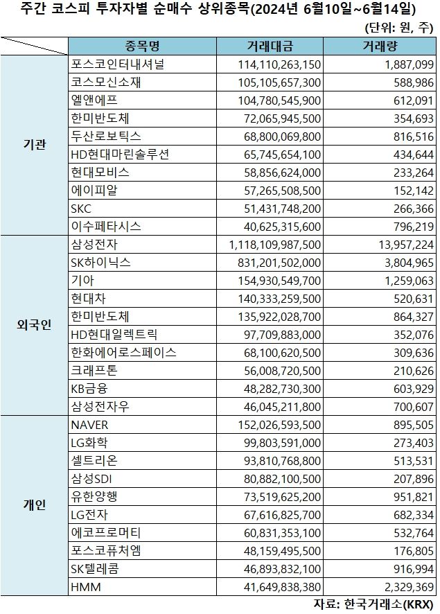 기관 '포스코인터내셔널'·외인 '삼성전자'·개인 'NAVER' 1위 [주간 코스피 순매수- 6월10일~6월14일]