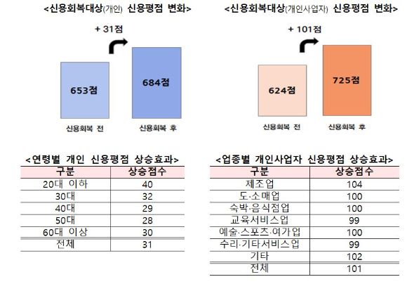 금융위는 "신용 회복 지원으로 빚을 갚도록 장려한 효과가 있었다"며 "앞으로도 많은 국민이 신규 금융 거래나 보유 상품을 더 유리한 조건으로 변경하는 게 가능할 것"이라고 말했다.