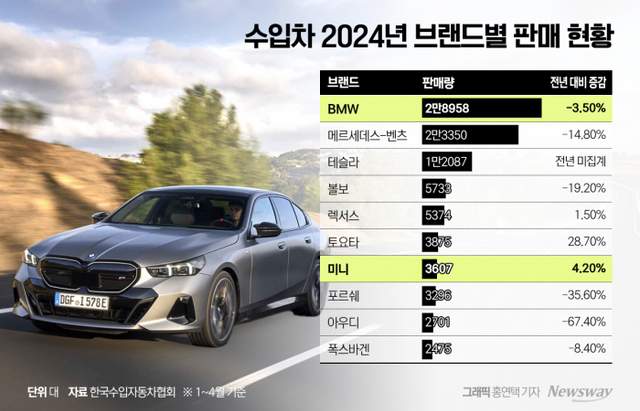 업계 관계자는 "지난해 메르세데스-벤츠를 제친 BMW가 올해도 공격적인 마케팅을 바탕으로 시장 입지를 강화하고 있다"며 "수입차와 전기차 시장의 침체 속에서 iX2, 미니 일렉트릭 등 신형 전기차의 흥행 여부가 관건"이라고 말했다.