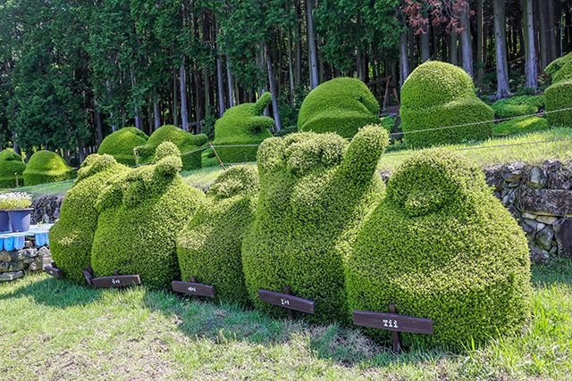 토피아랜드는 우리나라 최초의 토피어리 정원이다. 나무를 다듬어 다양한 모양의 작품을 만드는 것을 토피어리라고 한다. 토피아랜드에서는 무려 600여점의 토피어리 작품을 한자리에서 만날 수 있다. 공룡, 거북이, 오리 가족 등 귀여운 동물은 물론 뽀로로, 라바, 포비 같은 만화 캐릭터까지 다양하다. 금방이라도 칙칙폭폭 달려갈 것 같은 기다란 초록 기차는 아이들이 환호하고, 거실 테이블과 소파 작품은 엄마들의 눈길을 붙잡는다. 아이도 어른도 활짝 웃으며 동심의 세계로 돌아간다.