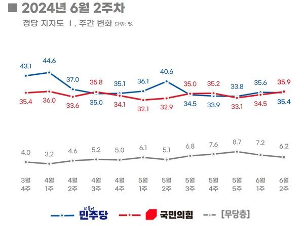 정당 지지율은 국민의힘 35.9%(1.4%P↑), 더불어민주당 35.4%(0.2%P↓), 조국혁신당 13.2%(0.2%P↑), 개혁신당 4.9%(0.3%P↓)로 나타났다. 이번 조사에서 민주당은 텃밭인 호남에서 11.5%P 하락했고, 국민의힘도 핵심 지지층인 70대 이상(4.2%P↓)와 60대(5.0%P↓)에서 하락세를 보였다.