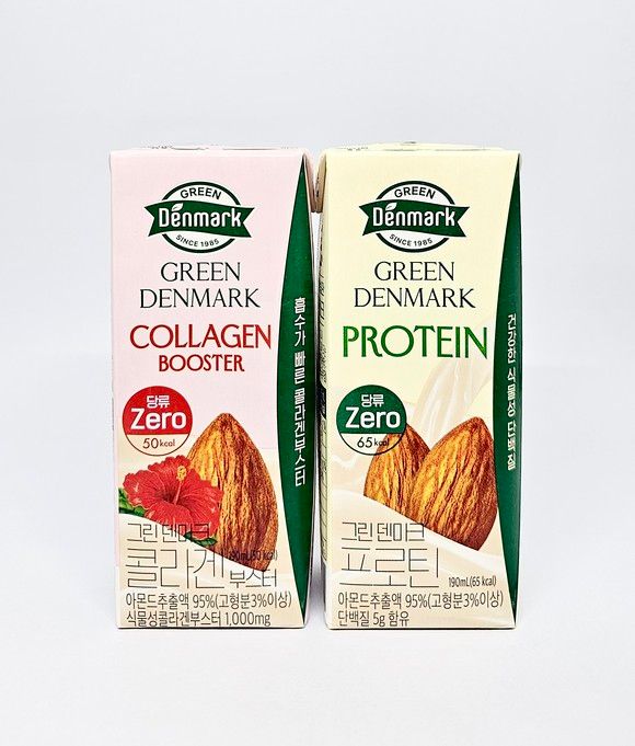 '그린덴마크 콜라겐부스터'는 흡수가 빠른 식물성 콜라겐부스터 1000㎎과 프랑스산 프리미엄 비오틴이 들었다. '그린덴마크 프로틴'은 100% 식물성 단백질(5g)과 비타민 3종(B, C, E), 칼슘을 함유했다. 모두 당류 함량이 없어 열량이 각각 50㎉, 65㎉ 수준이다.