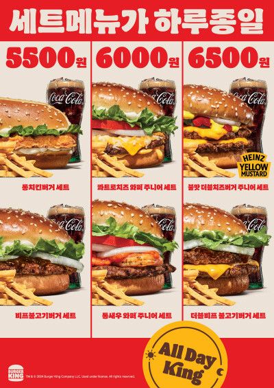 '올데이킹'은 시간제한 없이 온종일 버거킹의 세트 메뉴를 5500원부터 6500원까지 할인된 가격으로 즐길 수 있는 대표 가성비 라인업이다.