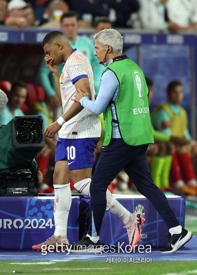 좀처럼 응답하지 못한 음바페는 후반 40분 세트피스 상황에서 헤더를 시도한 뒤 상대 수비수 케빈 단소의 어깨와 강하게 충돌하며 쓰러지기도 했다. 코 부근 큰 출혈이 이어졌고, 육안으로 봐도 그의 코가 골절된 걸 확인할 수 있었다.