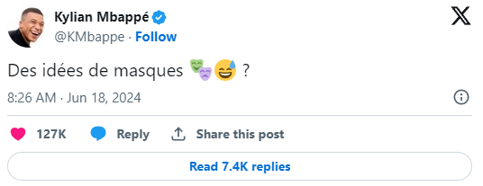 미국 USA투데이에 따르면 음바페는 심각한 부상을 당한 후에도 유쾌함을 잃지 않았다. 자신의 소셜네트워크서비스(SNS) 계정에 "어떤 마스크 쓸지 아이디어 있나요?"라고 글을 올렸다. 동료들과 팬들의 의견을 묻기 위해서였다.