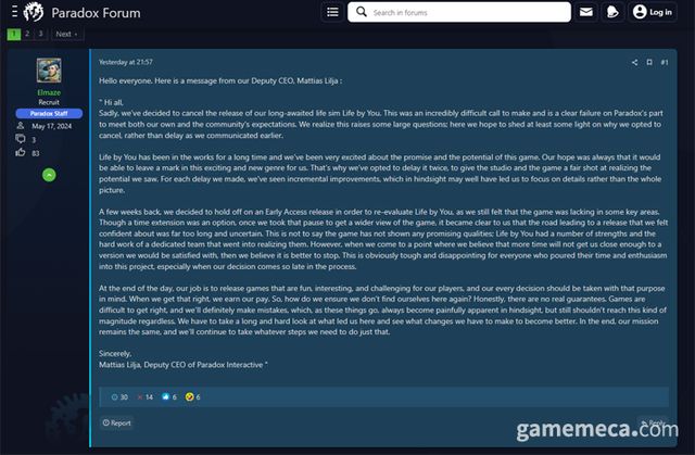 패러독스 인터랙티브 마티아스 릴리아(Mattias Lilja) 부사장은 17일 자사 공식 포럼에 라이프 바이 유 프로젝트를 취소했다고 발표했다. 그는 “오랫동안 기다려온 인생 시뮬레이션 라이프 바이 유 출시를 취소하기로 결정했다. 믿을 수 없을 정도로 어려운 결정이었고, 명백한 실패다”라고 밝혔다.