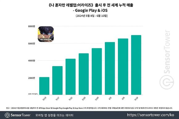 [아이뉴스24 정진성 기자] 넷마블의 '나 혼자만 레벨업: 어라이즈(이하 나혼렙)'의 글로벌 누적 매출이 7000만달러(약 965억7900만원)를 달성했다. 지난달 8일 출시 후 약 한달만에 거둔 성과다.