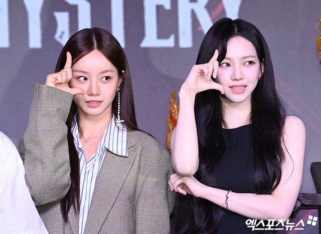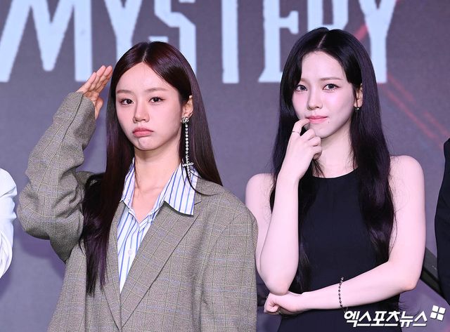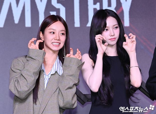 이날 제작발표회에 참석한 가수 겸 배우 혜리와 에스파 카리나가 포토타임을 갖고 있다.