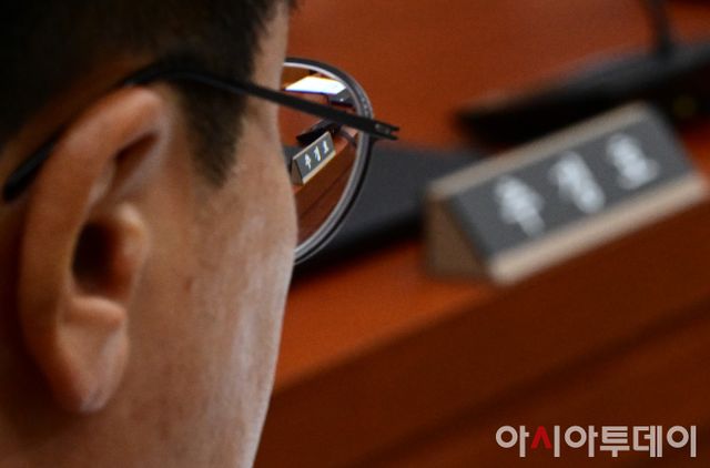 아시아투데이 이병화 기자 = 박찬대 국회 운영위원장이 18일 국회에서 열린 운영위원회 1차 전체회의에서 박 위원장의 안경을 통해 추경호 국민의힘 원내대표의 명패가 보이고 있다. 이날 국민의힘 의원들은 회의에 불참했다.